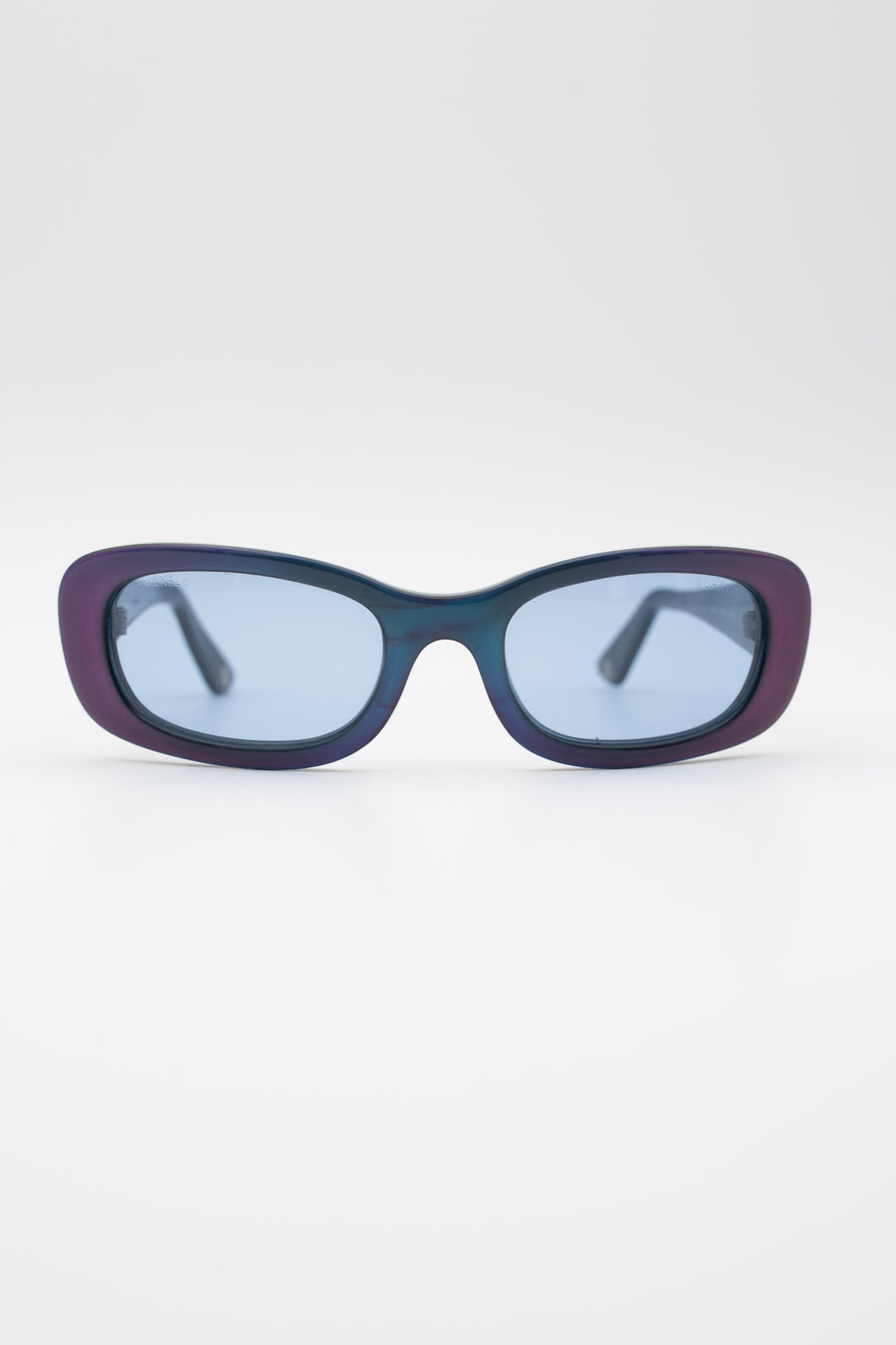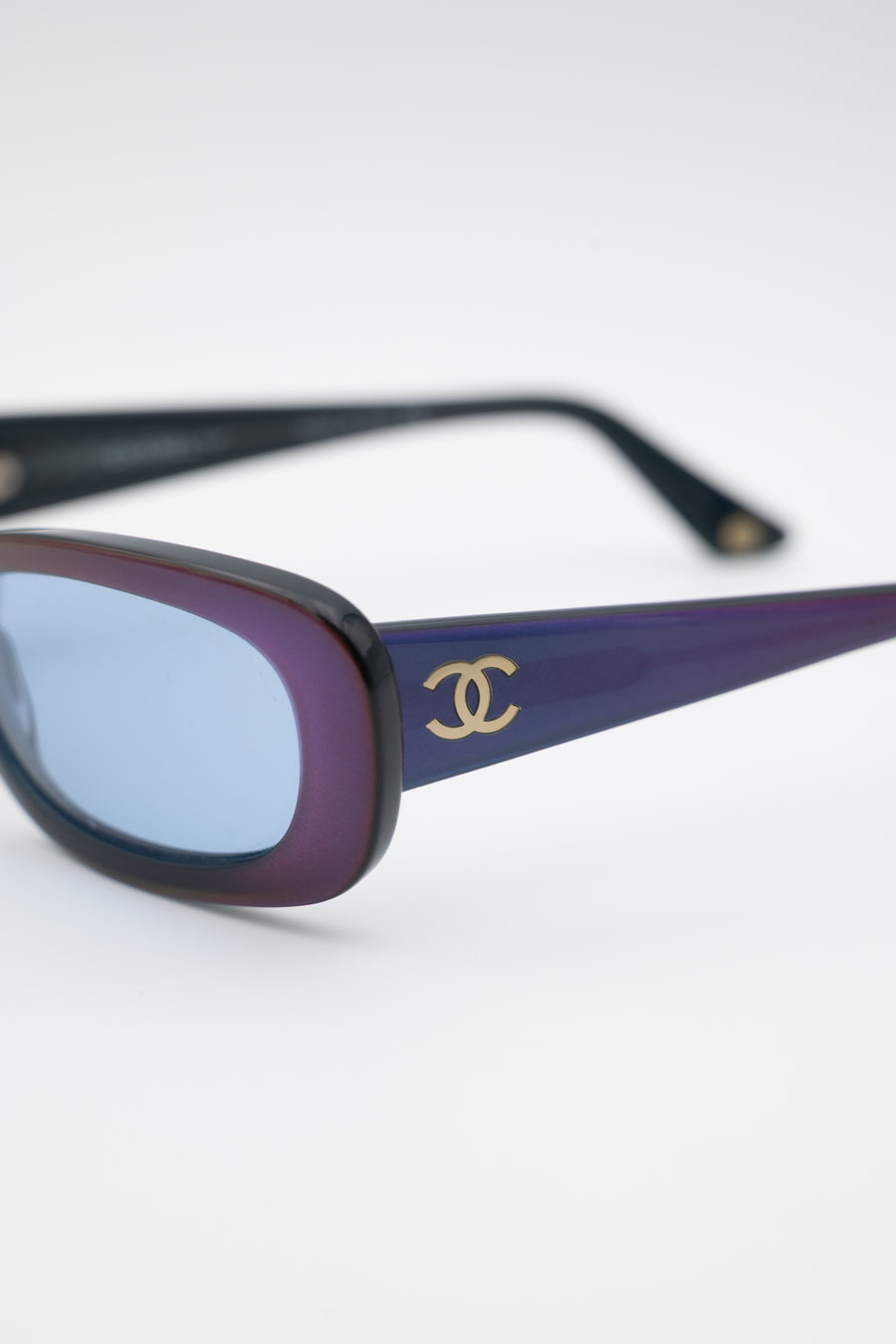 1990s Etro rectangular frame in deep navy acetate, reworked with warm gradient lenses and finished with textured blue arms. A bold, design-led piece with subtle detail.